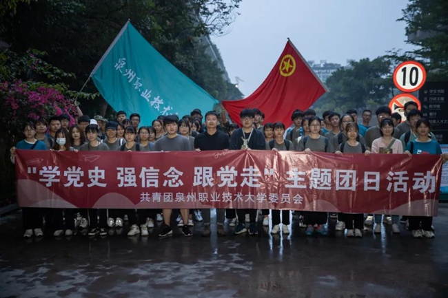 泉州职业技术大学开展主题团日活动。泉州职业技术大学供图 5月4日清晨5:04,泉州职业技术大学晋江校区100名师生徒步20公里前往晋江新塘街道梧林传统村落,用脚步丈量城市红色旅程,用心灵感受爱国热血温度,并完成传...