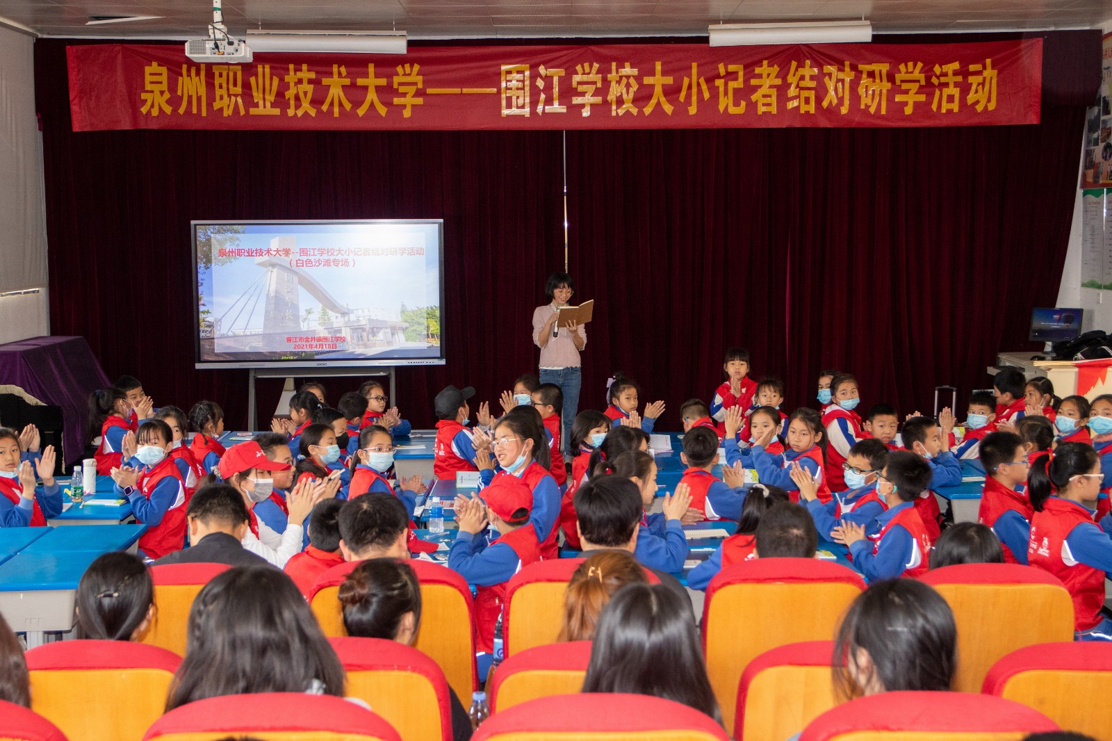 海浪滚滚,和暖的阳光照在金沙湾上,一个个小身影正忙着挖沙、堆沙、平整,最后与沙雕作品搞怪合影……这是大小记者与金沙滩的一次美好“约会”。 4月18日,泉州职业技术大学与围江学校“大学带小学,大手拉小手”大...