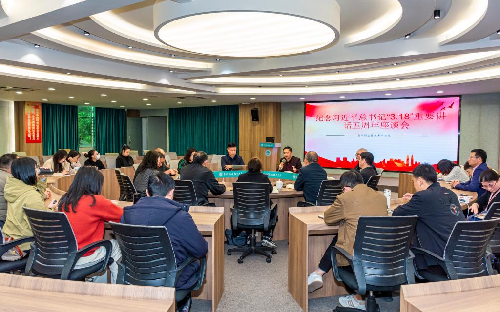 春光融融、万物复苏。3月13日下午,在习近平总书记主持召开学校思想政治理论课教师座谈会五周年之际,泉州职业技术大在A301会议室召开重温习近平总书记“3·18”重要讲话精神座谈会。围绕着不断提高思政课立德树人和教学水平的话题,老师们畅所欲言踊跃发言,回顾五年来马院的发展变化和交流自己重温习近平总书记“3·18”重要讲话的心得体会。校党委书记傅志雄,校务顾问、马克思主义学院院长来永宝,党委副书记、副校长蔡金佩,...