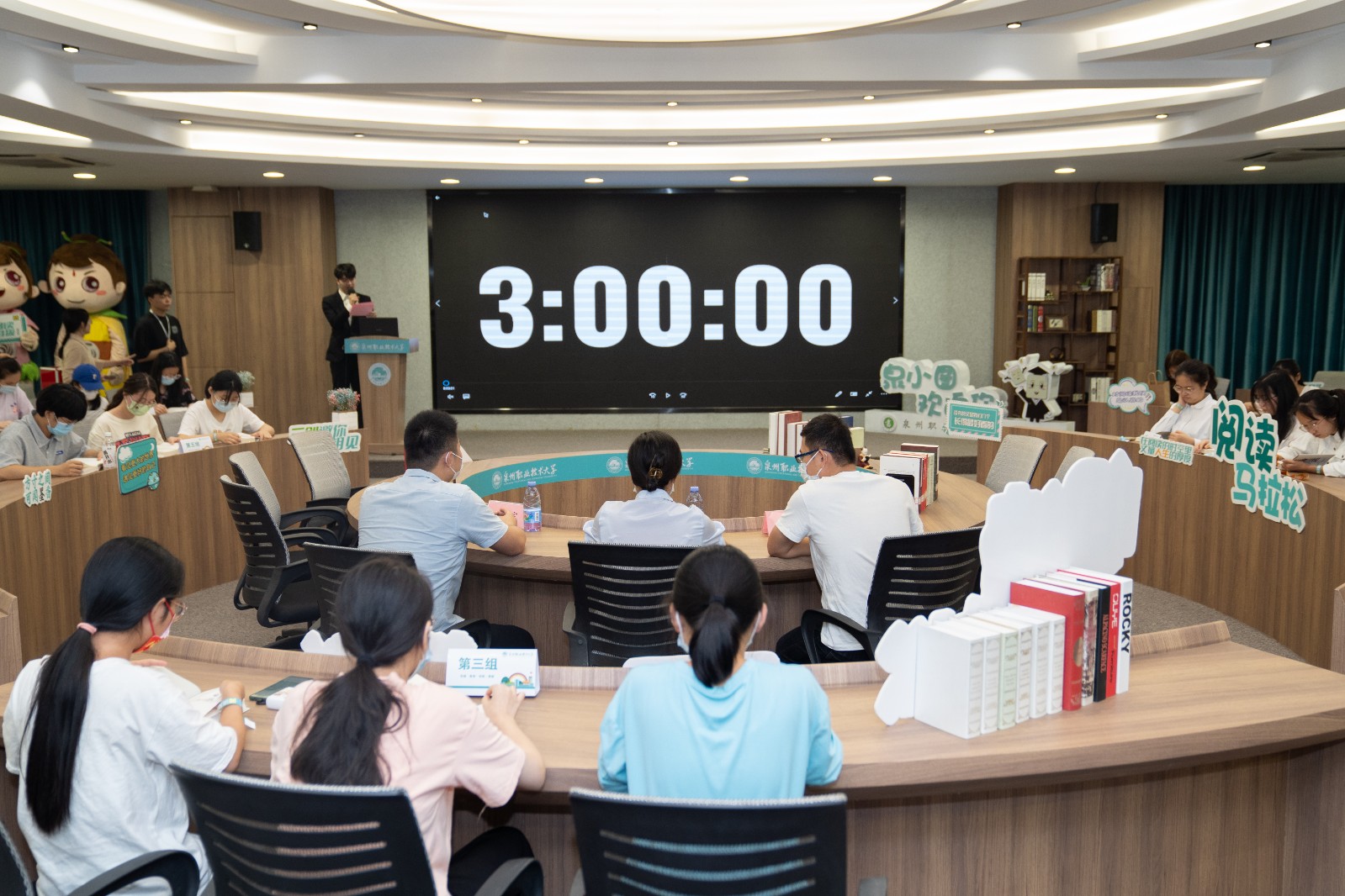 活动中,40多位同学每3人分为一小组,大家要在3个小时中共同阅读同一本指定书籍后,再完成测试。比赛开始,选手们翻开指定书籍——蔡崇达新书《命运》,顷刻间大家沉浸其中,国际会议厅只剩书页翻动声与选手呼吸声。只见电子屏上,时间一分一秒地跳动。长达3个小时的阅读,考验的是选手们的阅读耐力和阅读能力。这3个小时里,选手们通过深度阅读,让心沉下来。