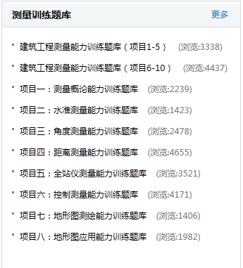 课程资源建设情况:现有建筑工程测量调研报告、课程总体设计方案、建筑工程测量课程标准、单元设计、电子教案(PPT演示文稿)、电子辅助教案、测量仪器操作录像视频、测量教学视频、全站仪模拟器、测量试题库与答案、建筑工程测量规范、数字地形图练习和企业项目案例库。
