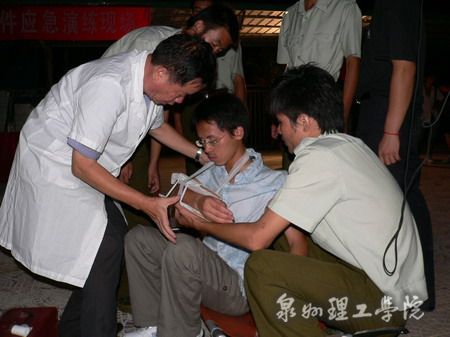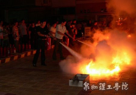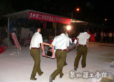 演练活动前,丰泽消防大队的蔡指导员在校学术报告厅举行了消防知识讲座。蔡指导员针对校园火灾的特点,结合丰富案例,向在场师生讲解了火灾成因及预防知识、疏散逃生常识,并现场示范了灭火器的使用方法。讲座后,同学们在学工处老师的统一指挥下,以湿毛巾捂鼻,模似火场逃生,以最快速度从消防通道安全下楼,在操场集合后,分组轮流使用灭火器进行实地灭火演练。而后进行施救伤员演练,由一名志愿者扮演在突发事件中受伤的学生,接到报告后,现场指挥通过广播通知医务室、校卫队紧急出动人员抢救伤员,在现场对伤员进行紧急护理后,由校车送往医院抢救。在紧急疏散演练中,各楼栋参演同学在接到广播通知后,直奔指定地点集合,由各楼管迅速清点人数无误后,全部演练项目完毕。最后,活动总指挥毛伟雄副书记对演练活动进行了总结,宣布本次演练圆满结束。
