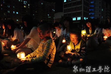 5月31日晚,烛光随晚风轻轻摇曳,音乐在泉州理工学院运动场荡响,手腕系着红丝带的男生女生们在夜色中为他们的学长肖立城默默祈福。