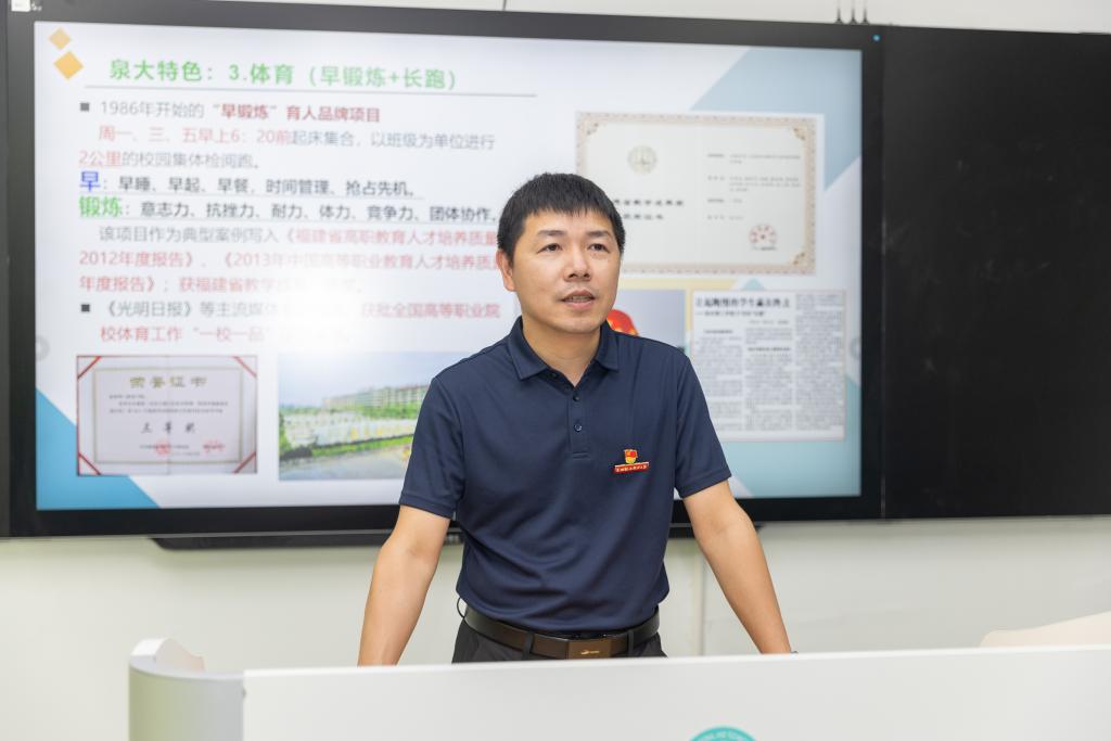 他从“泉大基因、泉大理念、泉大特色、泉大愿景”四个方面展开授课。课堂上,他与同学们重温了创办人吴金营先生的办学历程,以通俗易懂的方式向同学们介绍学校办学理念、办学宗旨、育人目标、校训、五道红线五把尺等校园文化核心。他解读了早锻炼、创业素质16条、成才笔记、情满校园主人周、传统文化进校园、双院制等泉大育人特色,生动阐述了办学以来始终坚持“以学生为中心”的办学理念,致力培养德智体美劳全面发展的社会主义建设者和接班人。他表示,泉大人的标志是艰苦创业、勇于创新、永不止步,这也是泉州职业技术大学的独特气质。