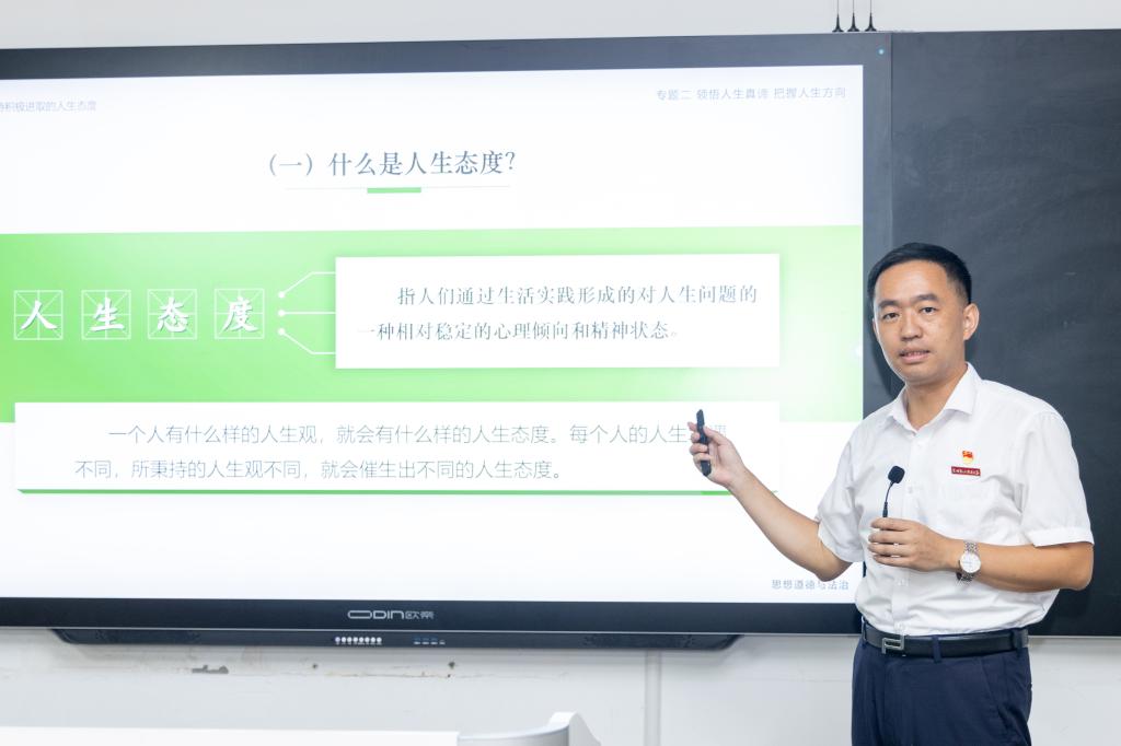 课堂上,傅志雄从历史与现实发展角度,结合新民主主义革命时代、改革开放和社会主义现代会建设新时期、中国特色社会主义新时代的发展脉络,引用大量鲜活的案例,从“坚持爱国爱党爱社会主义相统一”“坚持维护祖国统一和民族团结”“尊重和传承中华优秀传统文化”“坚持立足中国又面向世界”四个方面,给学生们讲清为什么爱、爱什么和怎么爱。