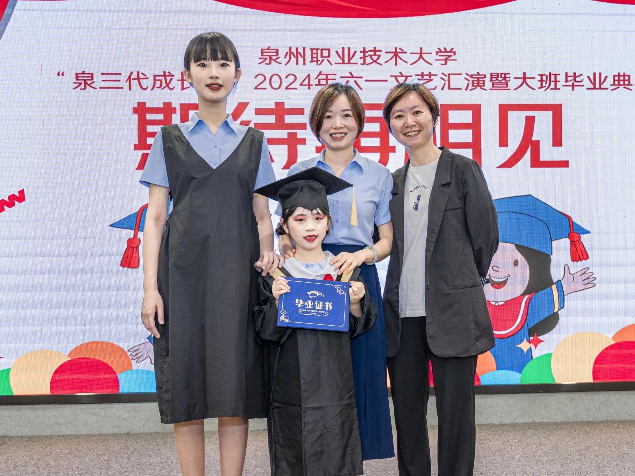 5月30日,泉三代成长营2024年六一文艺汇演暨大班毕业典礼举行。这场活动不仅是为了庆祝六一国际儿童节,这还是成长营大班小朋友们人生中第一个毕业典礼。活动中,孩子们化身小小歌唱家、舞蹈家、画家,用他们清脆的歌声、优雅的舞步和绚丽的画笔,献上一场充满“闽南味”的文艺表演。出席活动的有我校工会主席陈其生、副主席朱冰梅,教育学院院长张君,泉三代成长营负责人欧阳默涵,以及成长营小朋友与家长。
