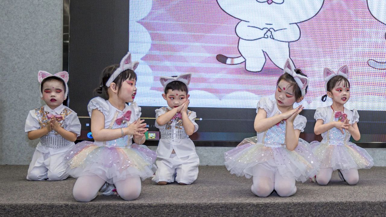 “天乌乌/欲落雨/阿公啊拿锄头/欲掘芋……”演出开始时,由中班、大班小朋友合作共同带来闽南童谣舞蹈《天黑黑》。伴随着音乐声响起,只见,孩子们穿戴着褐色的古装服饰,一会学着童谣里的老公公比划锄地的动作,一会又模仿老公公抓泥鳅的场景,表演得生动又俏皮。