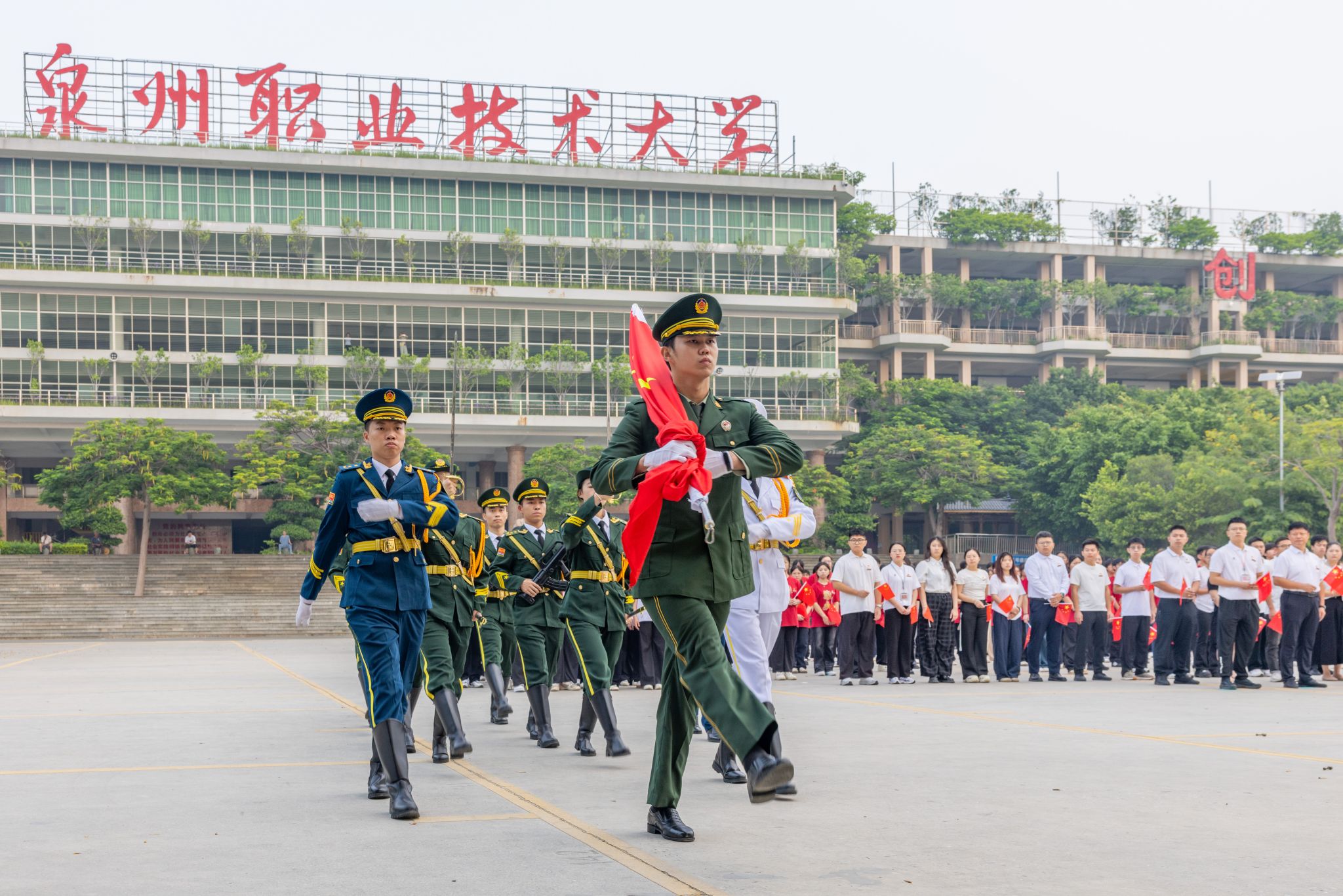 “80年前,中华儿女用忠诚与坚韧赢得民族独立;今天,泉大青年要以奋斗与担当续写复兴华章!”傅志雄在国旗下讲话,结合抗战精神与学校39年办学初心,向全体师生提出三点期许。