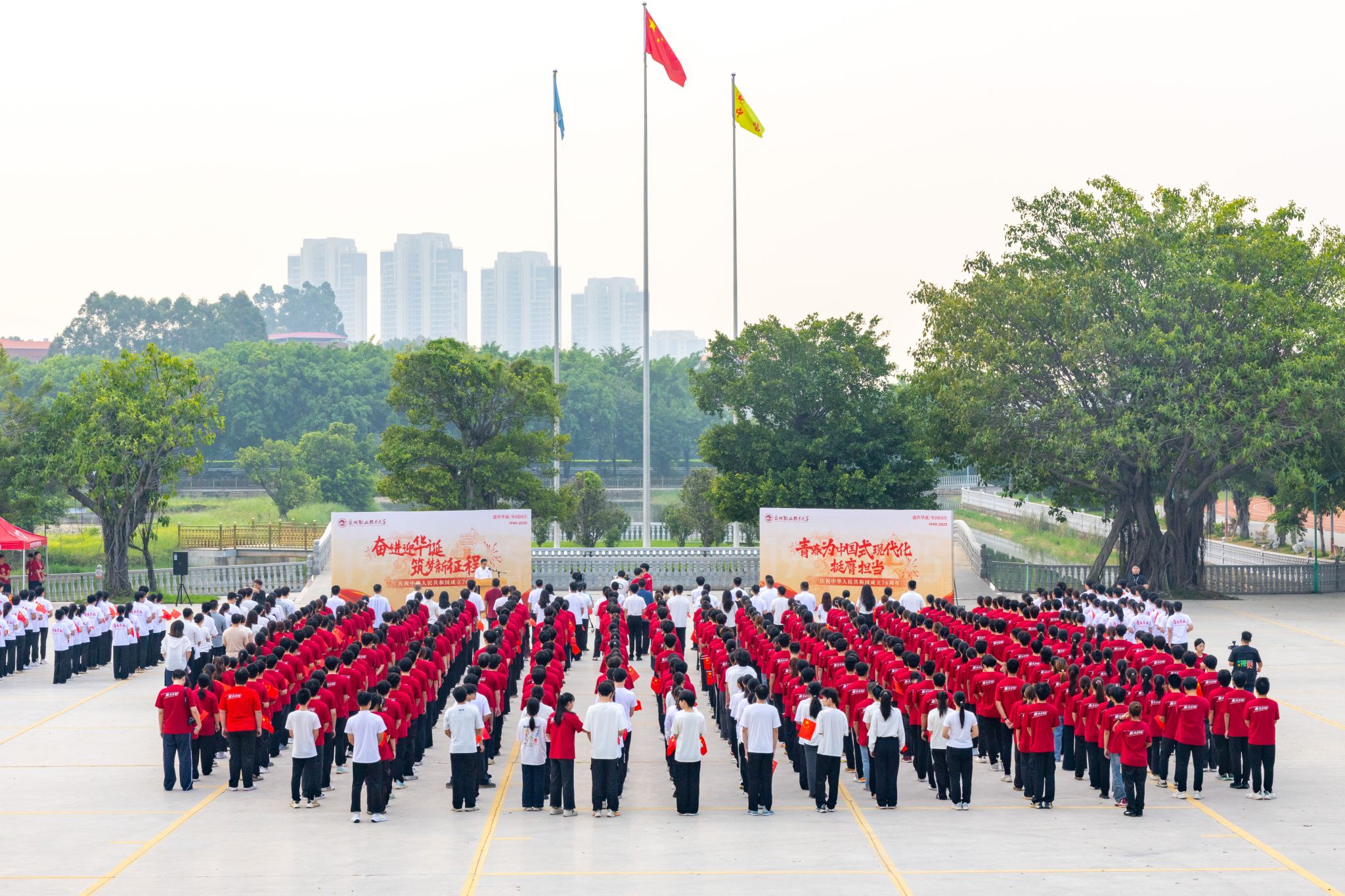 10月1日清晨,泉州职业技术大学师生代表齐聚国旗下,举行庆祝中华人民共和国成立76周年升旗仪式。校党委书记傅志雄、校党委副书记/副校长蔡金佩等校领导,各学院、书院党组织书记,各部门负责人,全体辅导员与学生代表共同见证五星红旗冉冉升起,以青春之名向祖国深情告白。