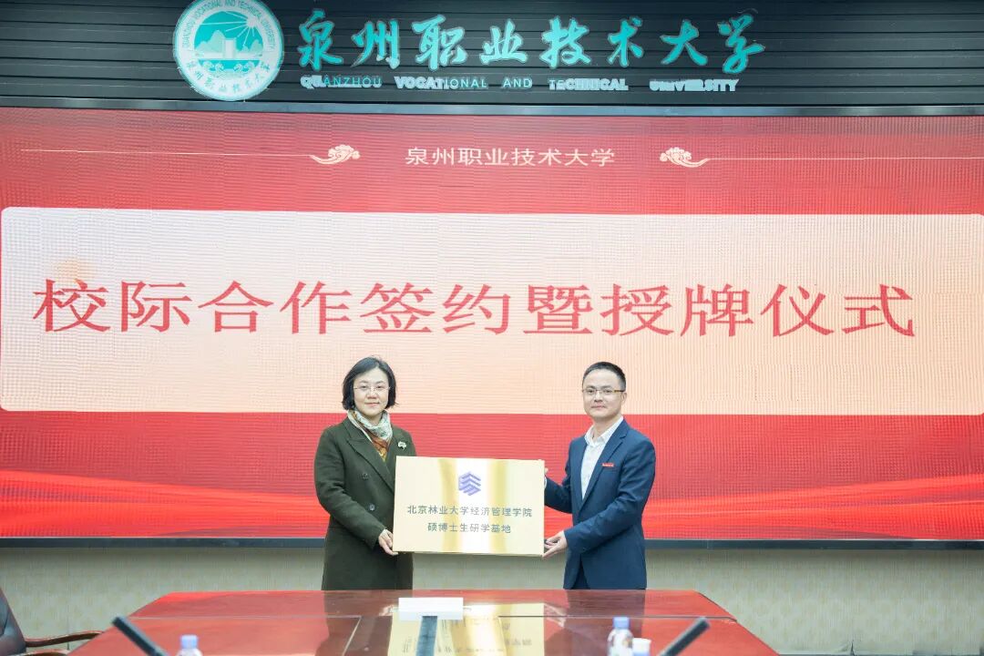 会议举行了简洁而隆重的签约授牌仪式。双方互授“人才培养基地”与“硕博士生研学基地”牌匾,并签署北林大经济管理学院和泉州职业技术大学人居环境学院合作协议。仪式后,双方互赠特色文创礼品,寓意携手共进的美好愿景。
