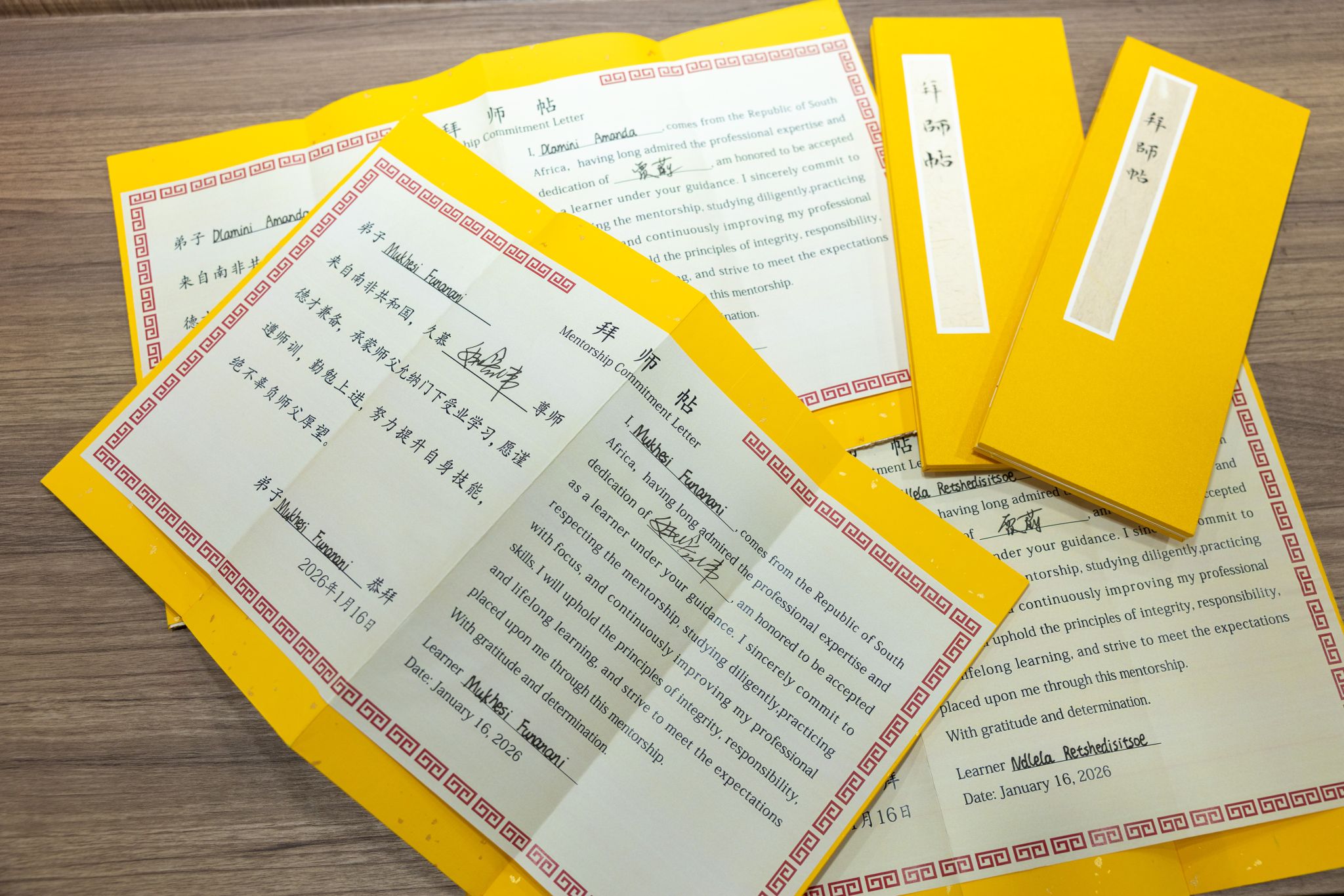 29位南非青年学员身穿汉服,分成6组一一站在老师面前,鞠躬、递帖、敬茶、回帖……在这个充满东方教育智慧与中南情谊的仪式中,学员们与博士、教授、企业家等导师一一结对。师徒结伴,心连中南,这不仅是技能传承的起点,更将不断延续中南友谊。