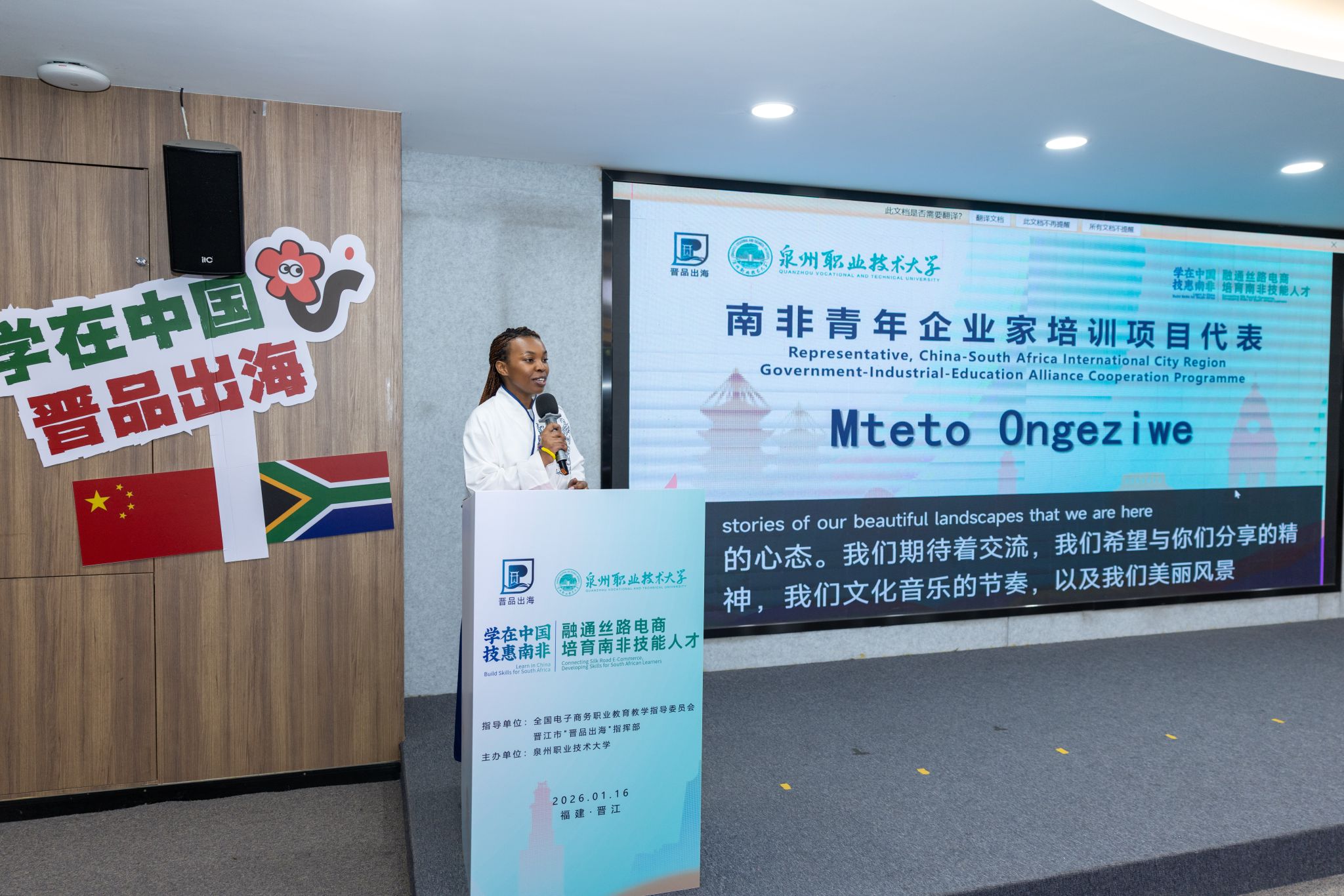 愿以此次专训班为起点,携手泉州职业技术大学,共同探索“产品出海、品牌出海、模式出海、企业出海”的四级进阶出海新通路。在未来的西兰德合作中心,将设立专属的“晋江馆”,推动“晋品”与南非市场的深度链接,让更多晋江优品通过电商的桥梁,点亮非洲的万家灯火。