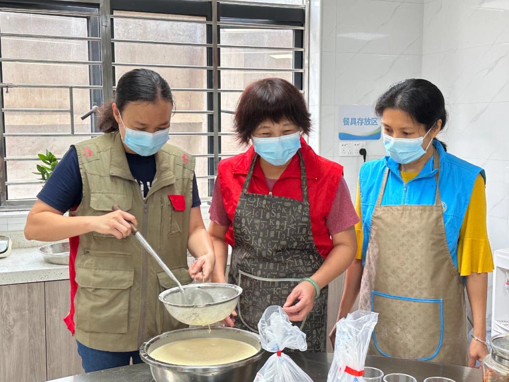 ▲2023年10月19日,广东东莞,东莞市大众社会工作服务中心驻寮步镇下岭贝村综合服务中心社工,与东莞友华医院驻下岭贝村日间照料站社工联合开展敬老月主题活动,发挥志愿者美食特长,制作秋季滋润糖水和鸡蛋糕送给老人。图为社工与志愿者一起制作美食。