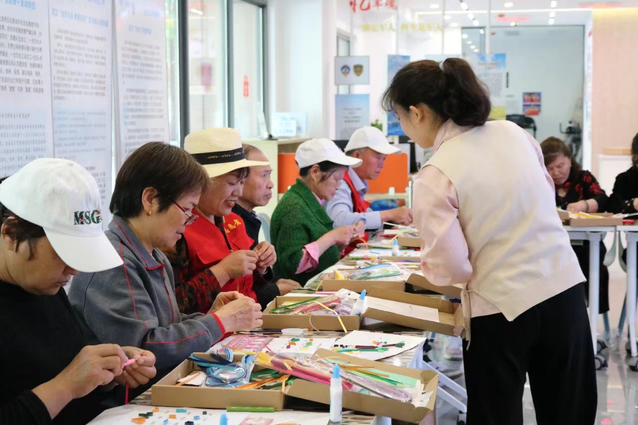 ▲2023年5月11日,浙江省杭州市钱塘区白杨街道社会工作站社工联合志愿者在东保社区开展衍乐荟社团活动。图为社工和志愿者与社团成员一起进行衍纸手工制作。