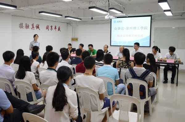 日,众事达—泉州理工学院校企合作订单班开班仪式在众事达(福建)信息技术有限公司泉州分公司隆重举行。众事达泉州分公司肖志忠总监、商学院院长翁长武教授,商学院党总支书记陈荣惠、商学院院长助理吴剑峰以及众事达员工代表、商学院教师、学生代表参加了此次开班仪式。