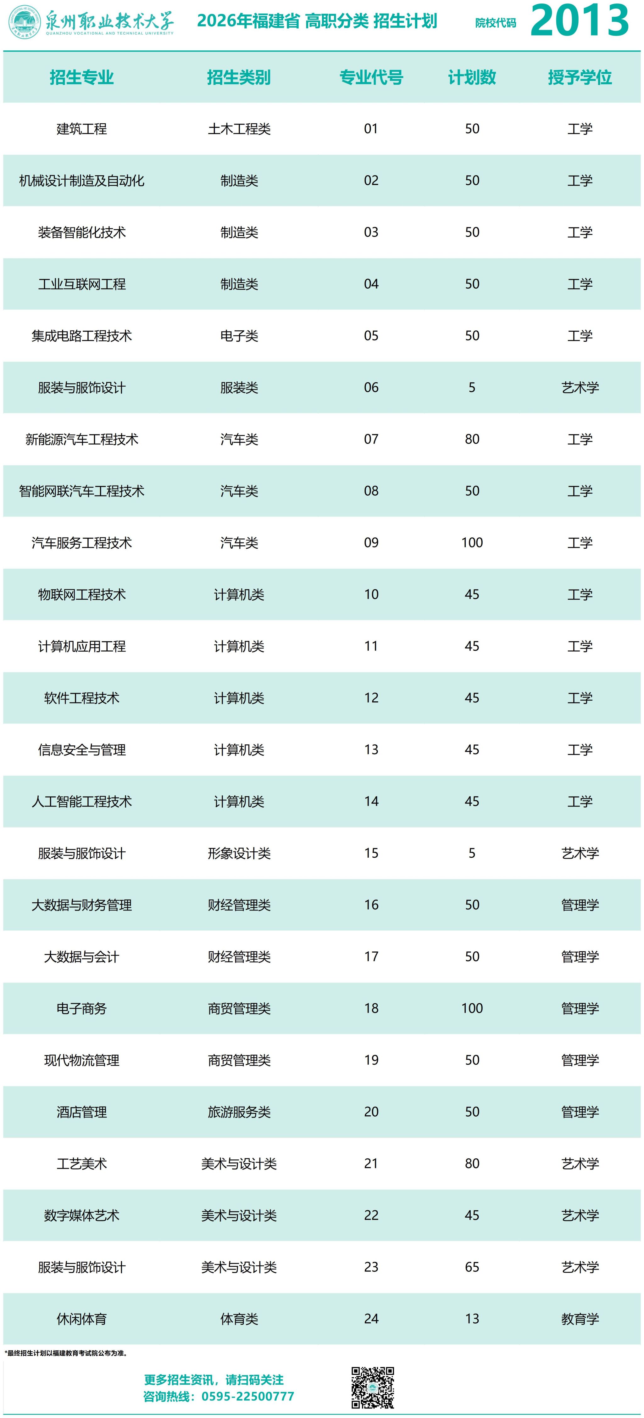 泉州职业技术大学2026年高职分类招考招生计划表
